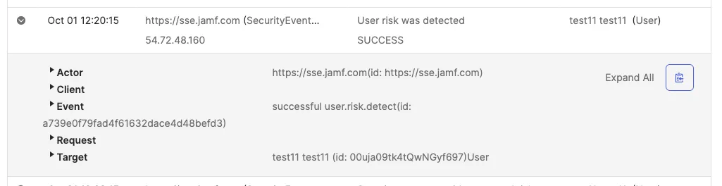 | Shared Signals Framework(SSF) | security.events.provider.receive_event | Oktaがセキュリティイベントプロバイダーからリスク信号を受信したときに記録されます |