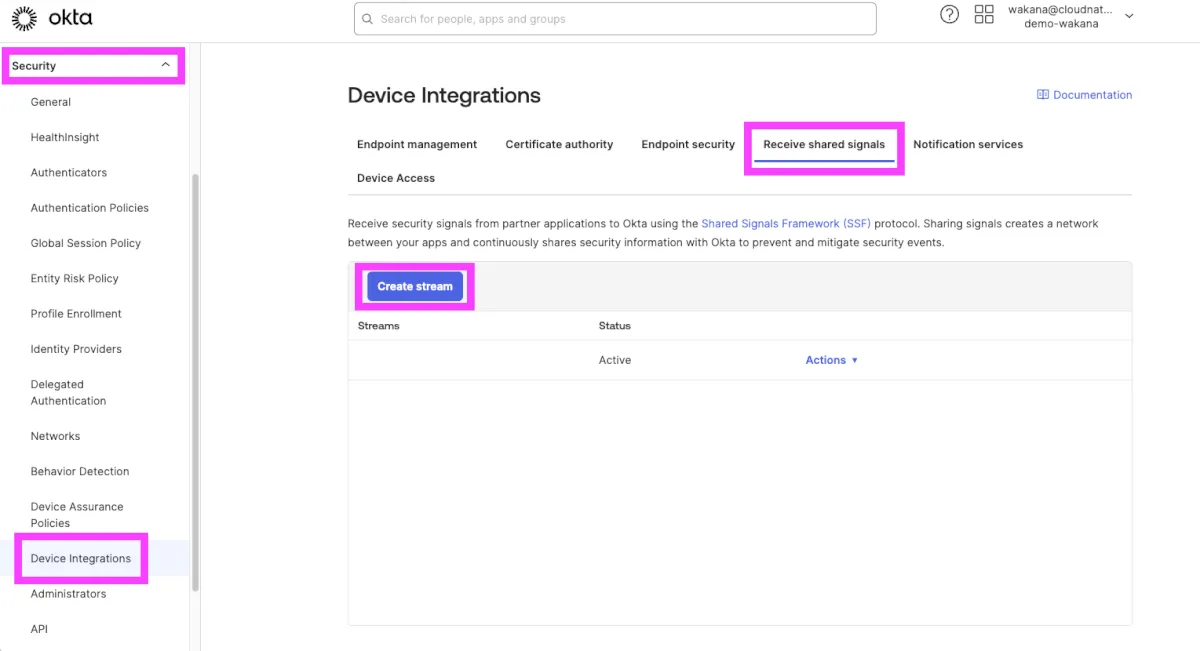 - Okta Admin ConsoleでSecurityを選択し、Device Integrationsに移動します。Receive shared signalsタブをクリックし、Create streamボタンを押下します。