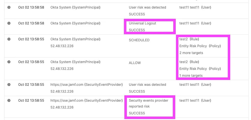 | Universal Logout | user.session.end | アクセス違反への対応としてOktaがUniversal Logoutを呼び出したときに記録されます |