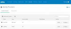 Oktaのダッシュボード上にはIdentity Providersという項目があります。 ここではOktaをSPにする。つまり他のIdPになりえるなにかで認証を行い、Okta自体にパスワードやプロフィールの更新を必要としない状態になります。 また、JIT(Just In Time)を利用する事もできるので、Oktaのドメインを知っている尚且つ連携しているIdPからの認証で自動でOktaにユーザーが作成されるということも可能です。