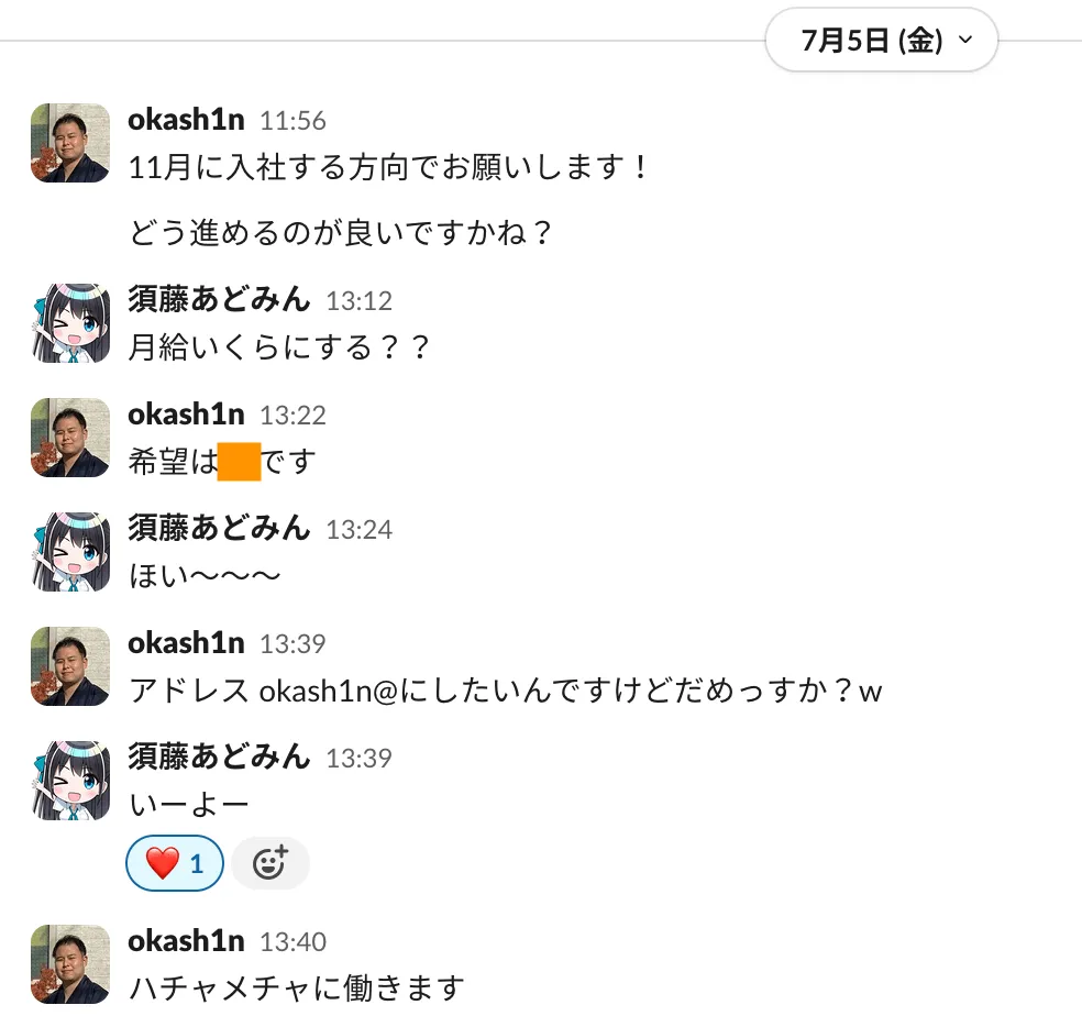 みたいな話をして、そのあとリーグオブ情シスの打ち合わせをしている時に「じゃあ近々行きます」みたいな話をした記憶があります。そこから、自分は前職スタディストの社内でいろんな人に相談したりとかして、決心がついたのでSlackで連絡しました。