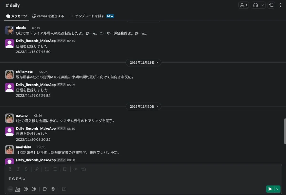 - 営業担当者がSlackチャンネルに日報を投稿