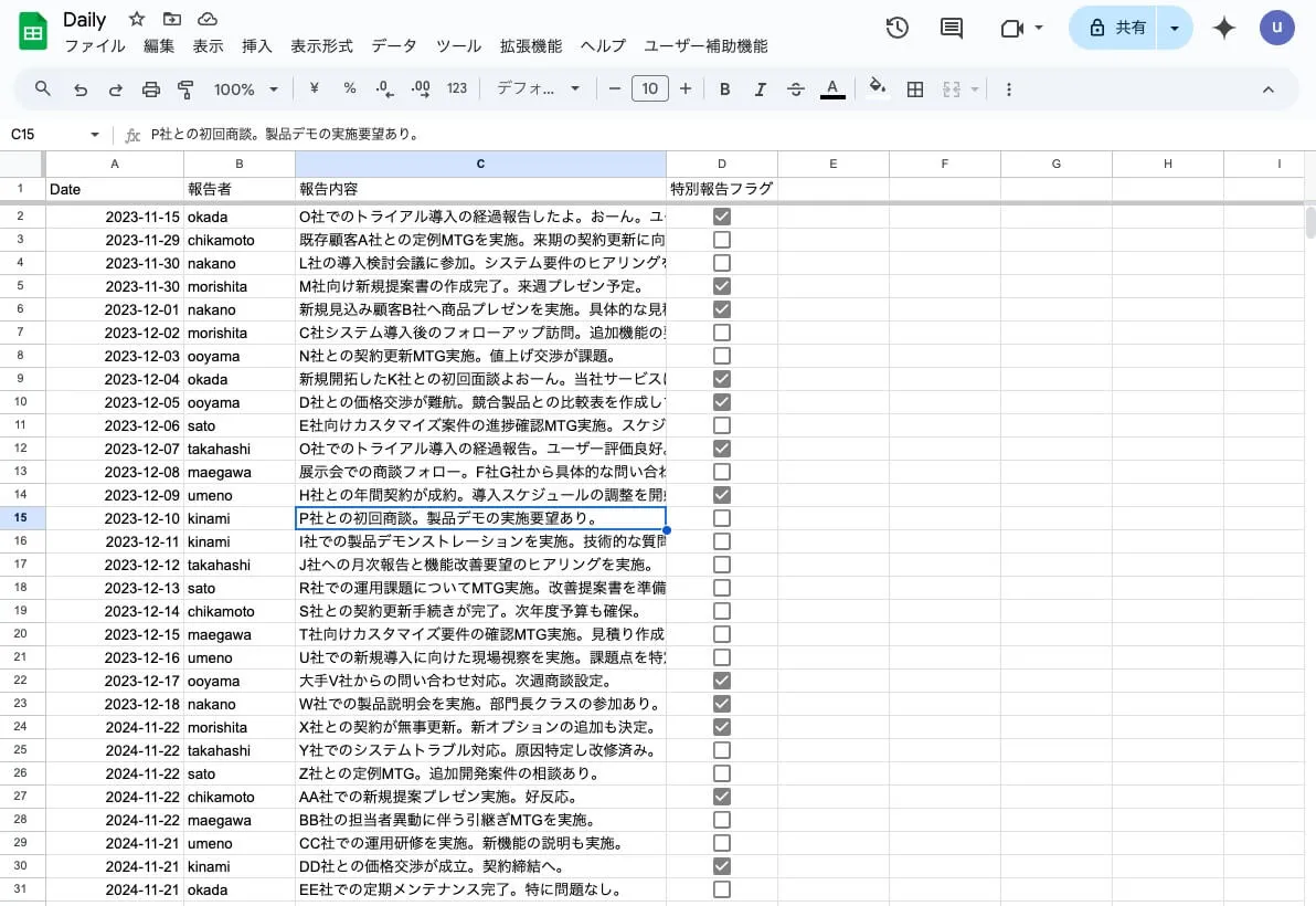 - 共有スプレッドシートの該当行に自動で記録