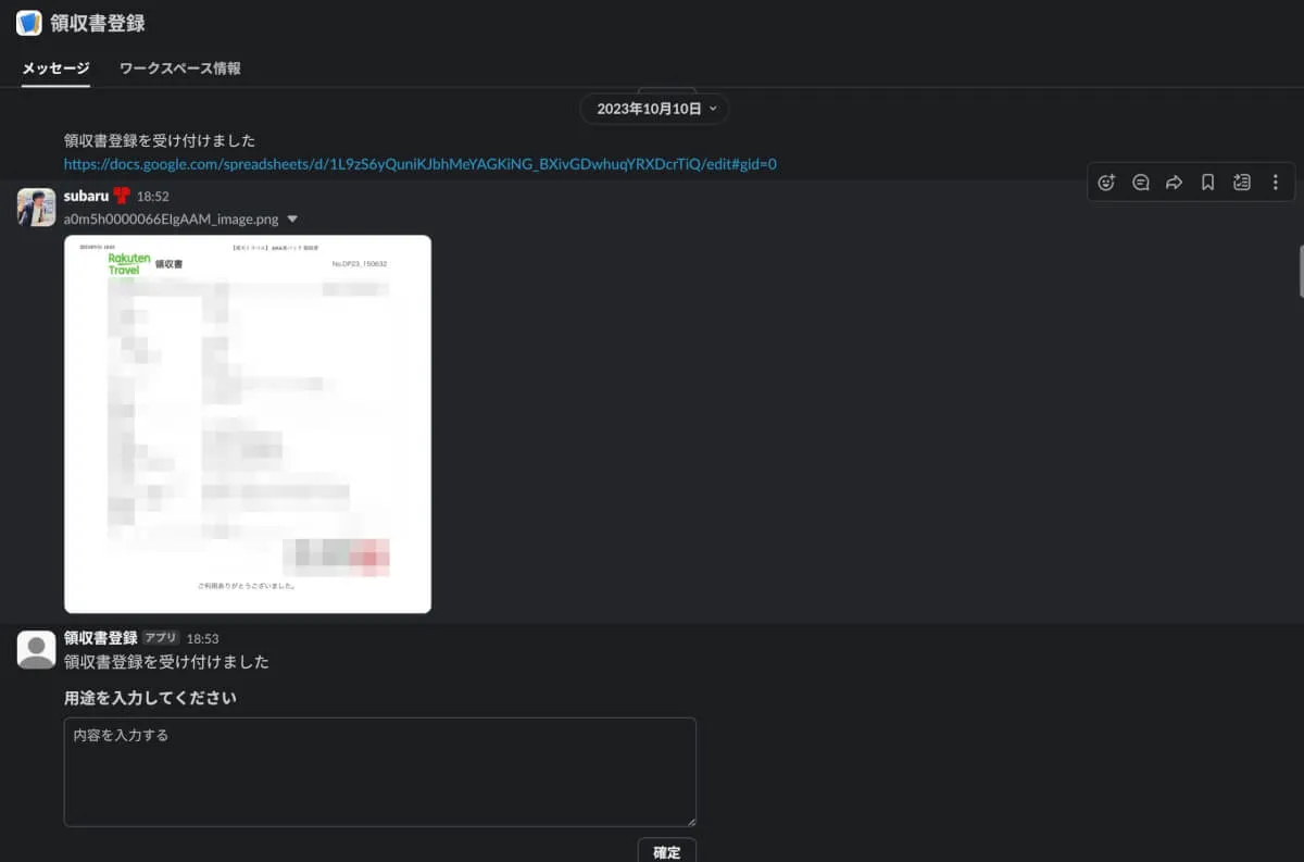 - Slackチャンネルに請求書や領収書の画像を投稿