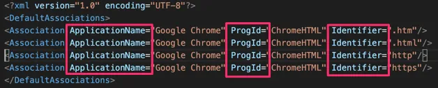 XMLファイルを生成した際に、多数の拡張子の紐付け設定が生成されます。 本設定を応用する事で、ブラウザ以外の既定のアプリの設定も変更を施す事ができます。