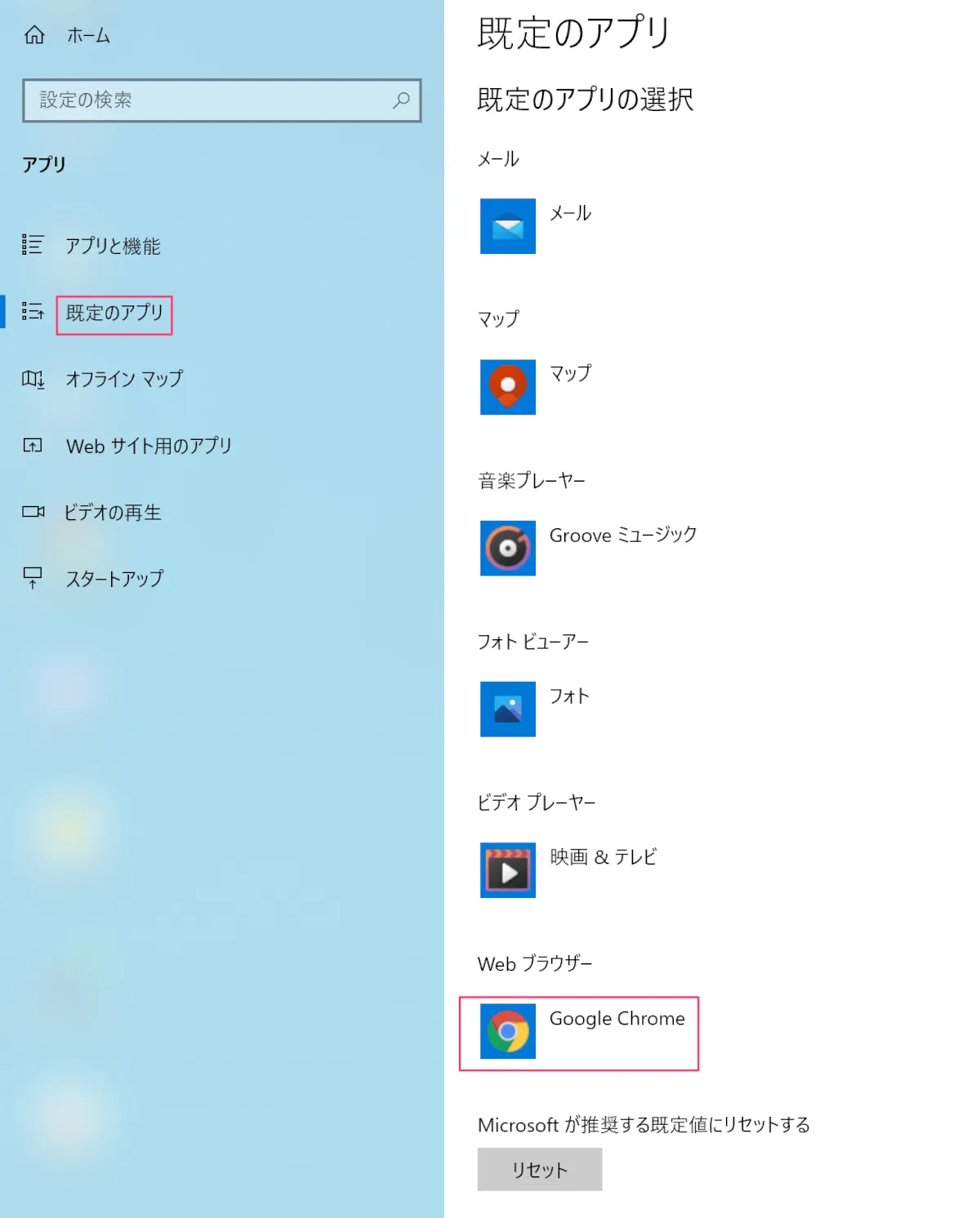 再起動後に「既定のアプリ」を開き、想定通りに紐付けが変わっていれば完了です。