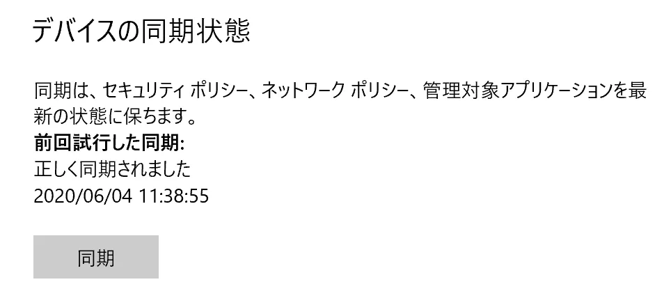 【同期方法】 設定 > アカウント > 職場または学校にアクセスする > 組織情報を選択 > 詳細 内部の 同期 をクリック。