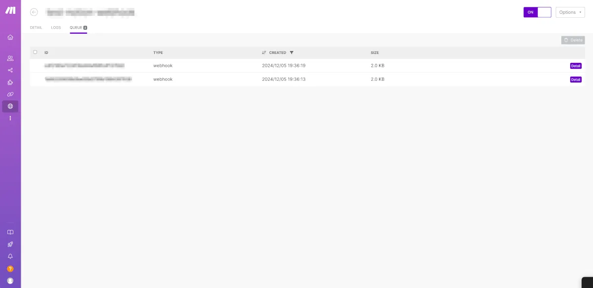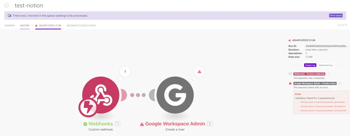 また、makeにはWebhookを受信してから呼び出しが実行されない場合、キューに処理が保存されます。Enterpriseの場合、10,000件まで保存できます。画面はこんな感じです。Detailsの画面ではWebhookで送信されたデータを確認できます。こちらの内容はまた別の機会に取り上げたいと思います。