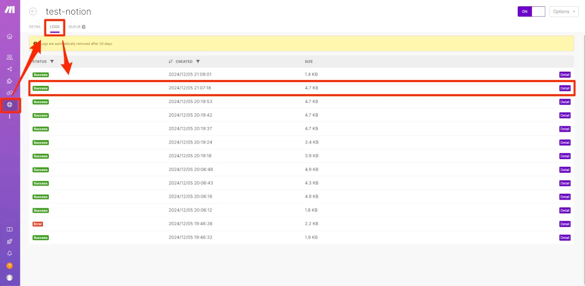 makeの画面に戻り、左側メニューのWebhooksから作成したWebhookを選択し、「Logs」タブから実行された履歴を確認できます。