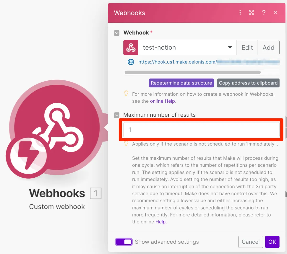 Schedulingで設定している場合は、Webhook Modulesの設定で「Maximum number of results」が定期実行の際にいくつのデータを実行させるか、上限として機能します。