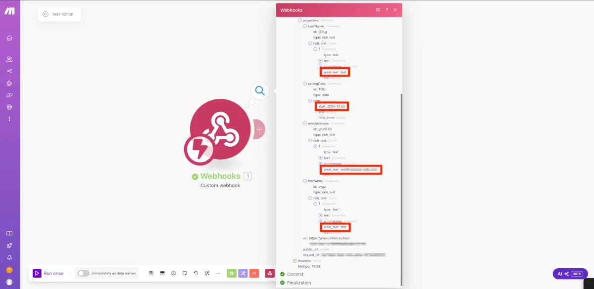 さらに「Run once」を選択してから、再度NotionのデータベースにてWebhookが送信されるように更新します。すると、以下のように受信したデータが表示されます。OUTPUTを開いていくとどのような構造で受信しているか確認できます。