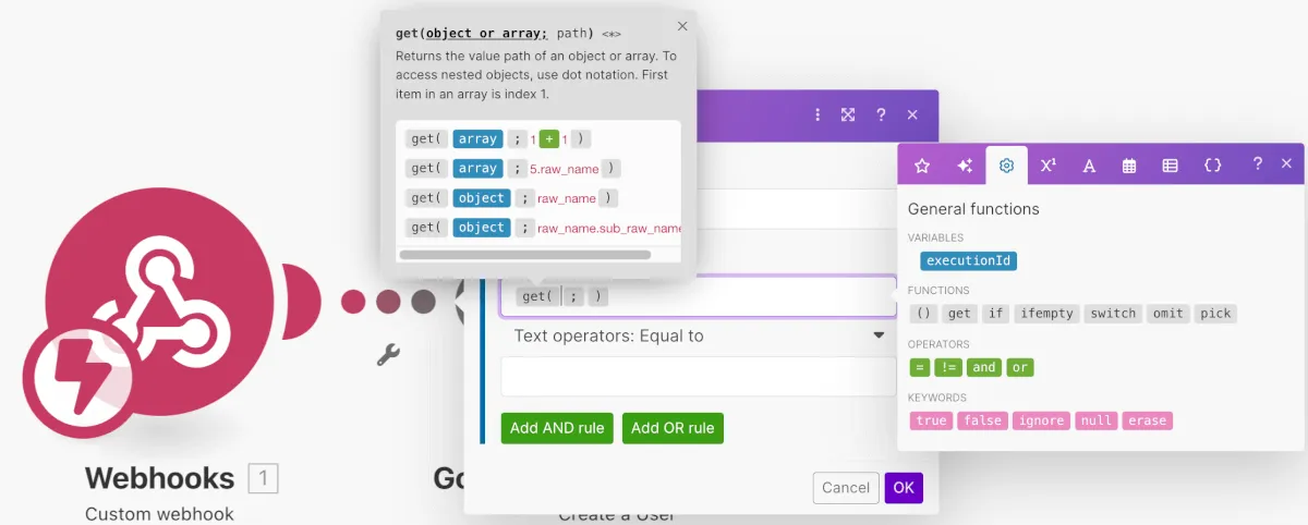 今回の設定の中では「Get request headers」を有効化していましたが、その場合、Headers[]の中から特定の値をget()とmap()関数で抽出することができます。関数の説明はmakeのScenarioの作成画面上で表示されるのでご安心を。