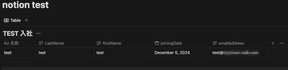 また、今回はNotionのデータベースに入社予定の方の「氏名」と「メールアドレス」が記載されている想定で作成しました。