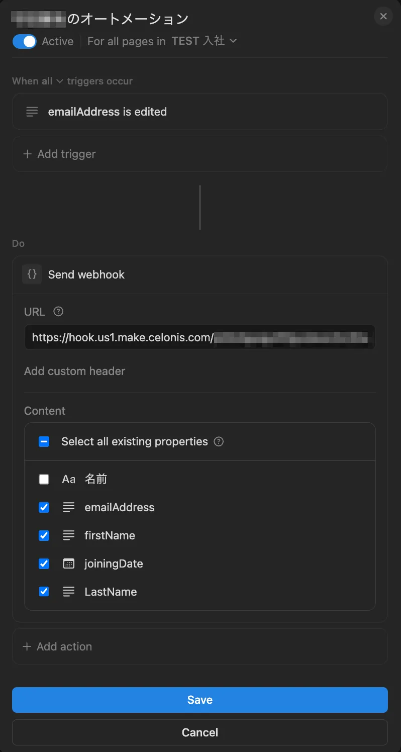 ここまで設定できたらNotionのデータベースにページを追加し諸々の値を入力してみます。上述の設定では簡易的にWebhookを使うことを目指しているため、実用性に欠けますがemailAddress以外を入力し、最後にemailAddressを入力するとWebhookが送信されます。
