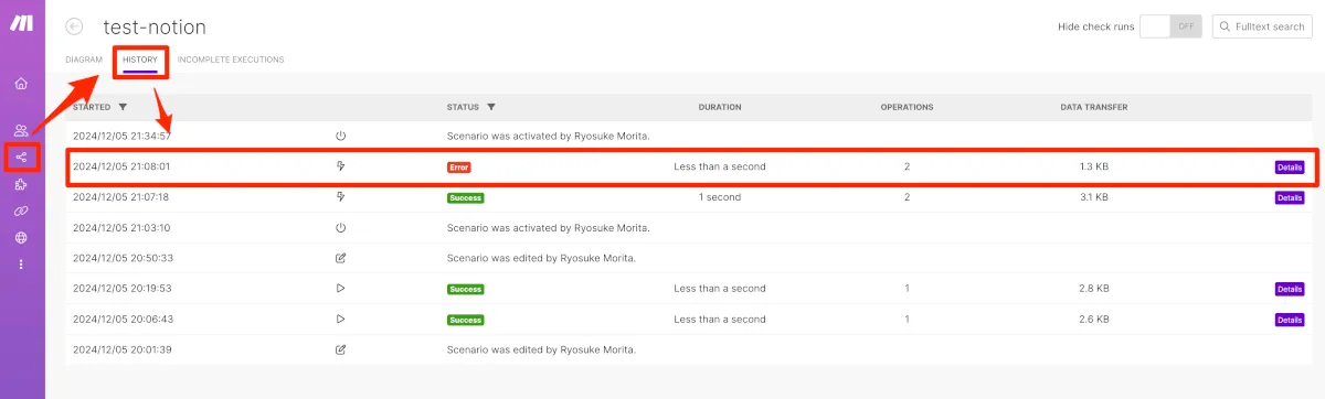 なお、実行結果のログはScenariosから対象のScenarioを選択し、「HISTORY」タブから確認できます。