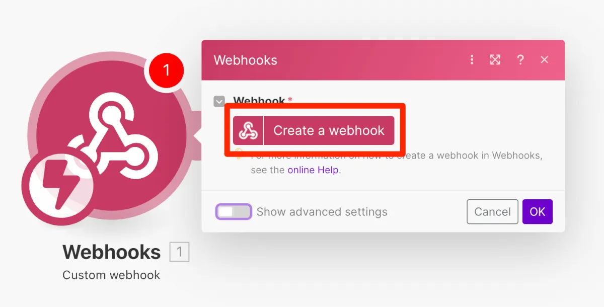 新しいScenarioを作成し、「Custom Webhook」を選択します。追加されたModuleを選択すると以下のような画面になるので、「Create a webhook」を選択します。