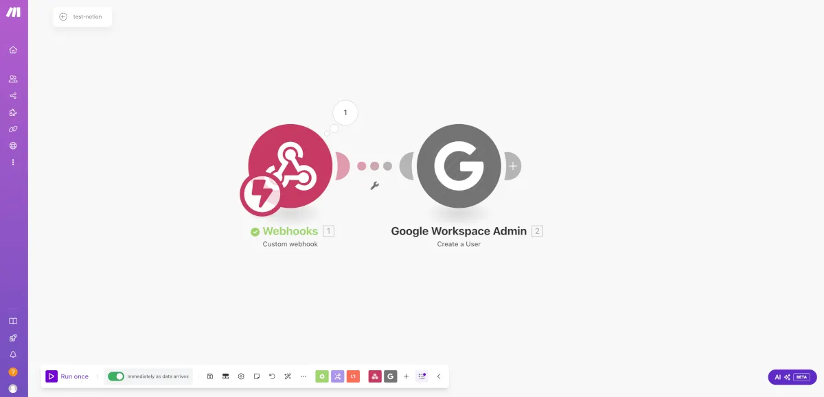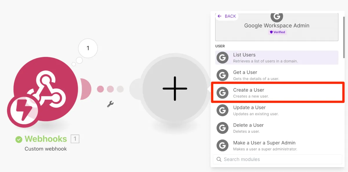 作成したCustom Webhooksの先にGoogle Workspaceの「Create a User」Moduleを追加します。