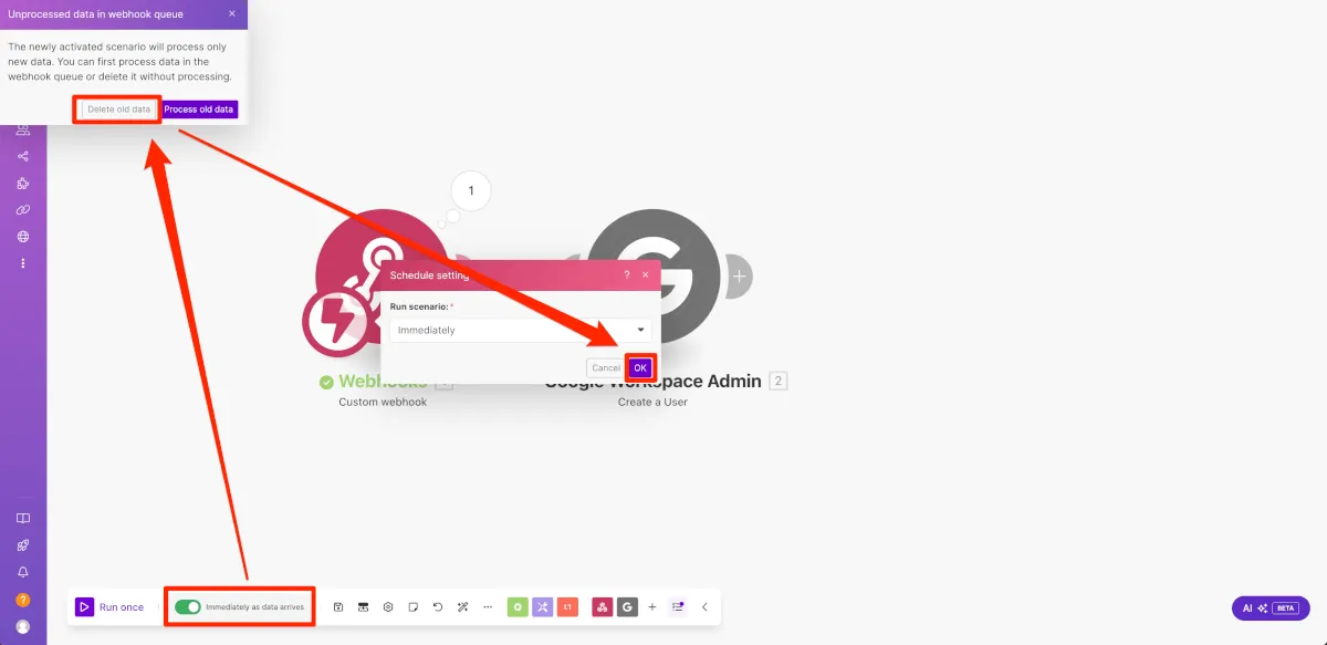 「Immediately as data arrives」をONにして、「OK」を選択します。もし画面左上にキューに関する表示がされたら、今回は「Delete old data」で削除して大丈夫です。設定できたらScenarioを保存します。