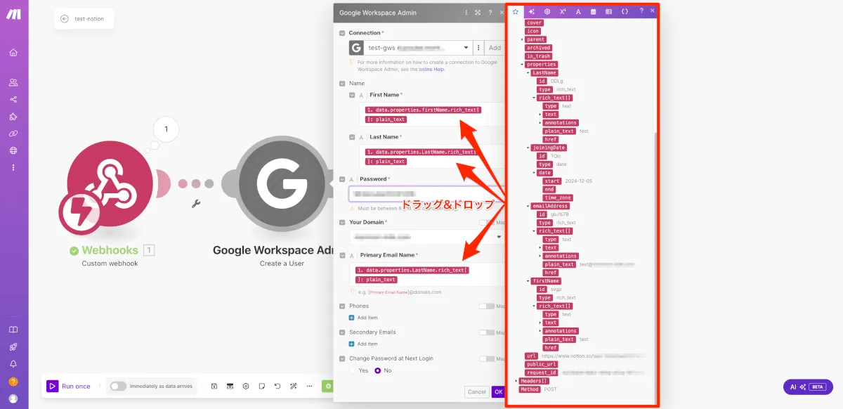 Google Workspaceの管理者アカウントでサインインして認証し、アカウント作成に必要な情報を入力します。Webhookで取得されたデータの構造を参照して、ドラッグ&ドロップで設定できます。Webhookの接続確認までの操作順に多少の癖を感じますが、Webhookさえ受信できてしまえば、あとは視覚的にも分かりやすいと思います。