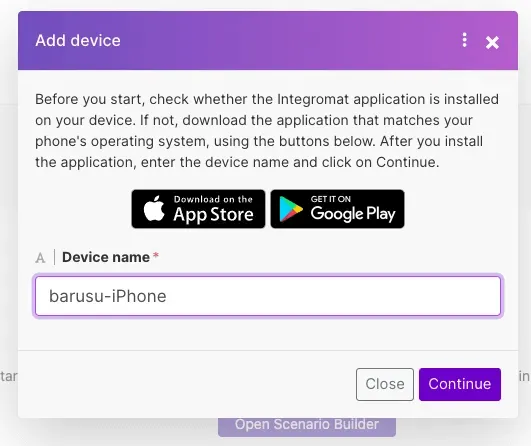 Before you start, check whether the Integromat application is installed on your device. If not, download the application that matches your phone's operating system, using the buttons below. After you install the application, enter the device name and click on Continue.
