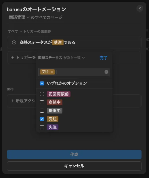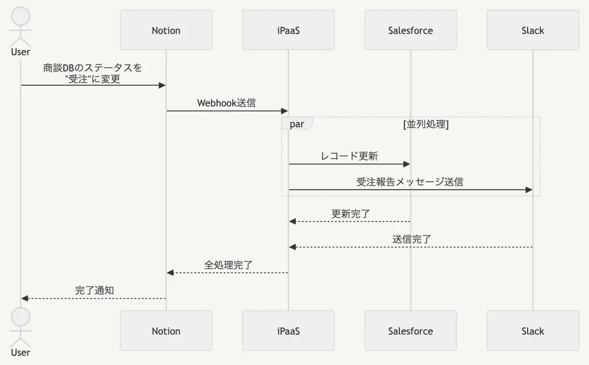 営業担当者が商談データベースのステータスを「受注」に変更したら…