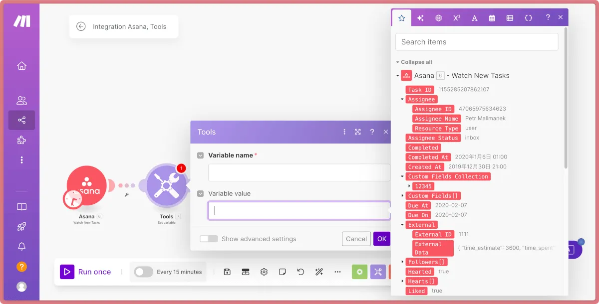 ですが、一度実行しないといけないのはモジュールとして不完全です。例えば、Asanaのモジュールであれば、実行前でもこのように候補が出てきます。