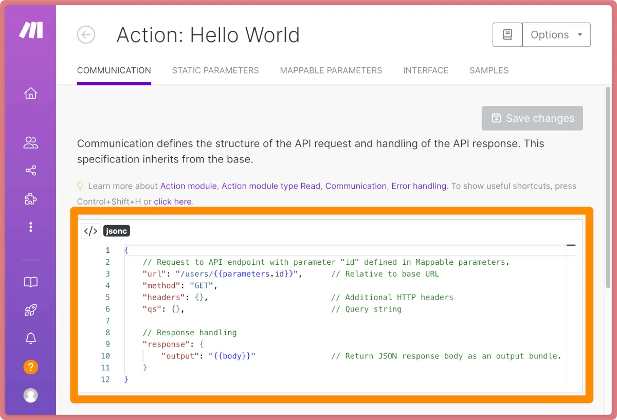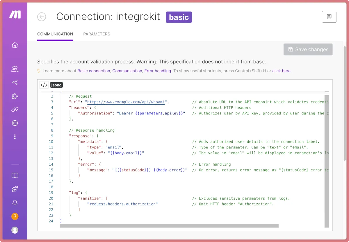 保存すると「COMMUNICATION」タブが開かれ、サンプルのJSONが入っているはずです。