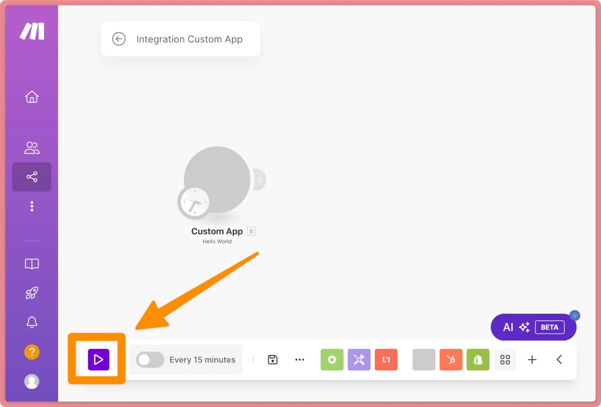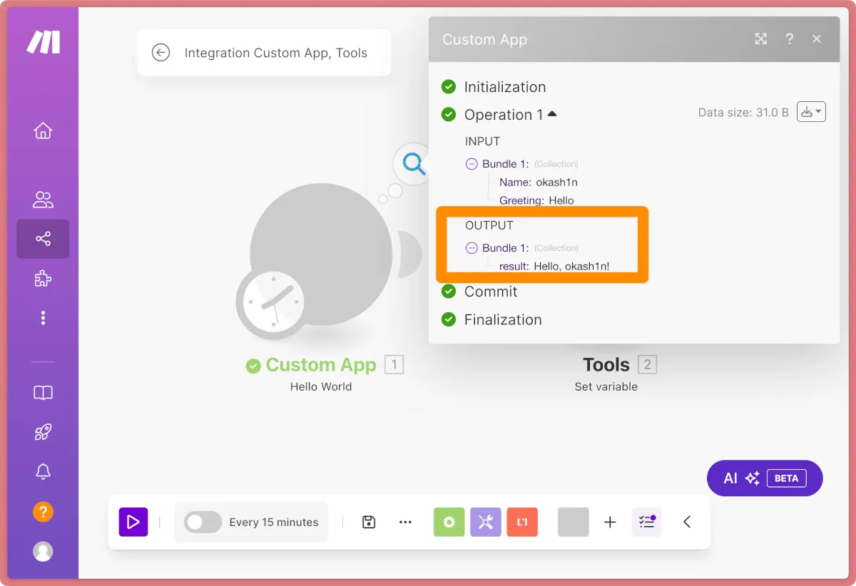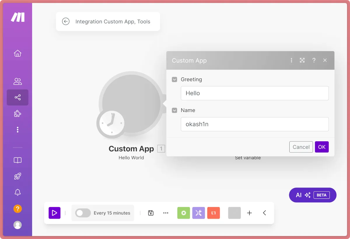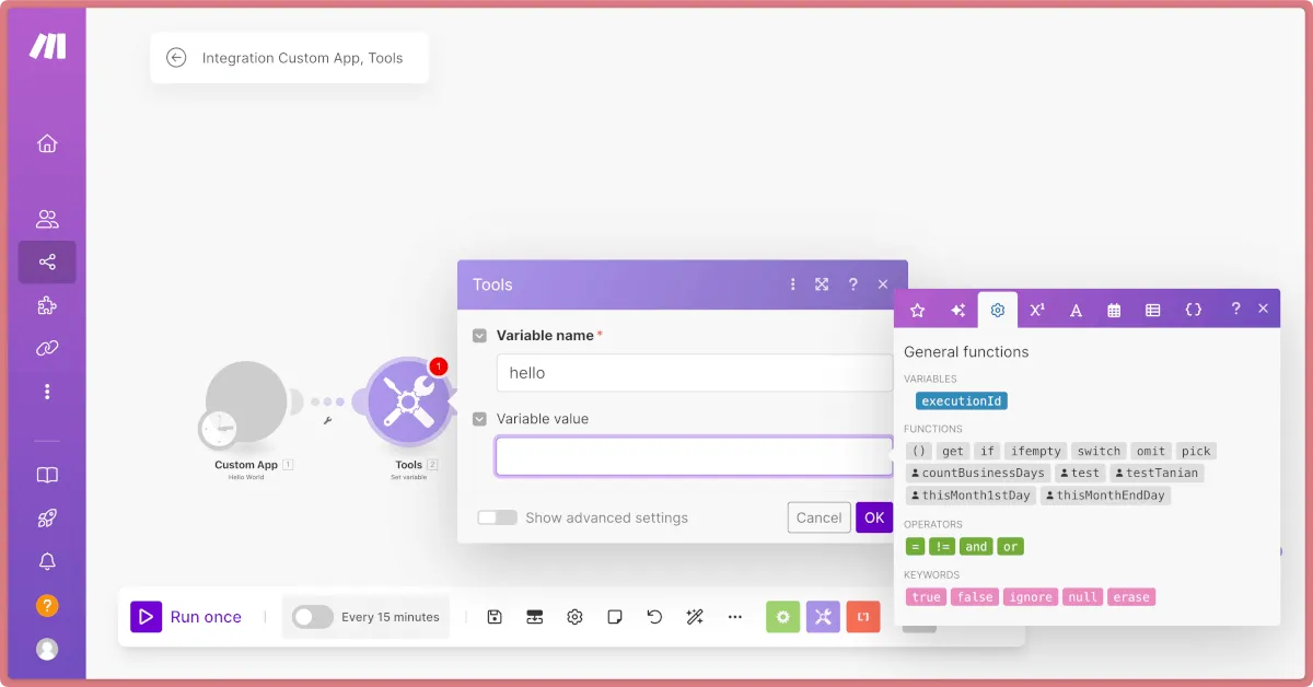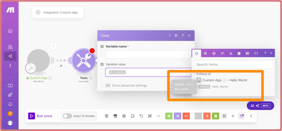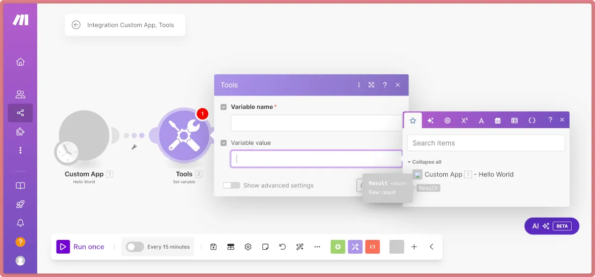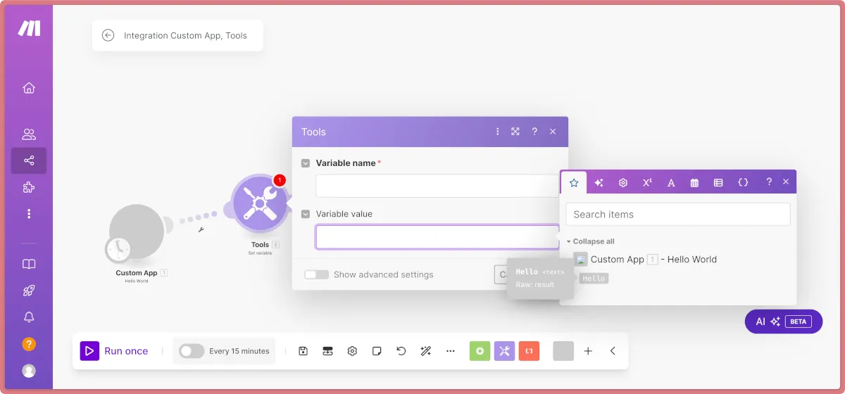 先ほど作りかけていたシナリオは削除してもう一度シナリオを作成します。Custom AppsとToolsのモジュールを追加します。