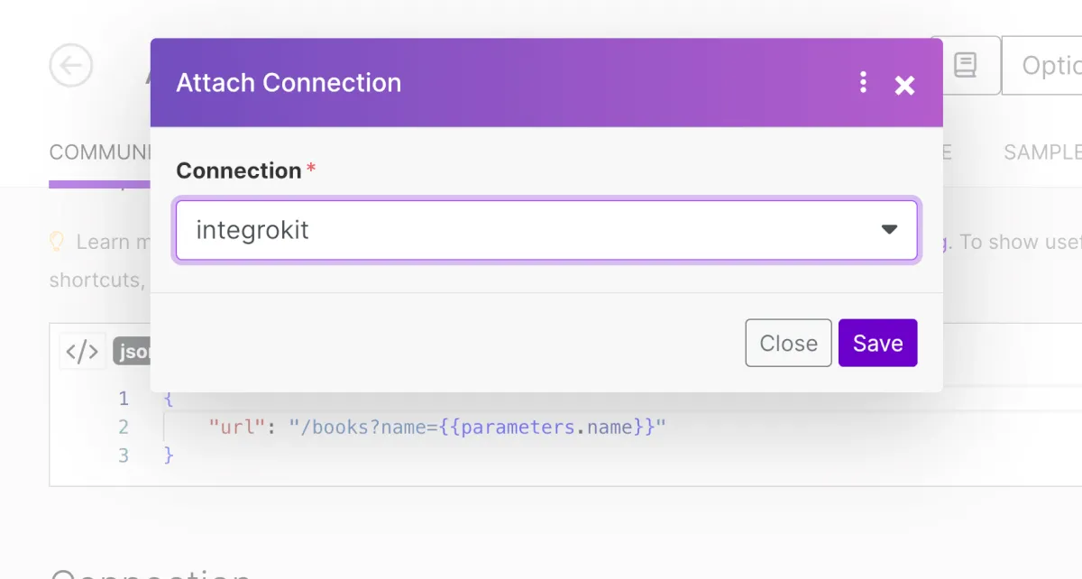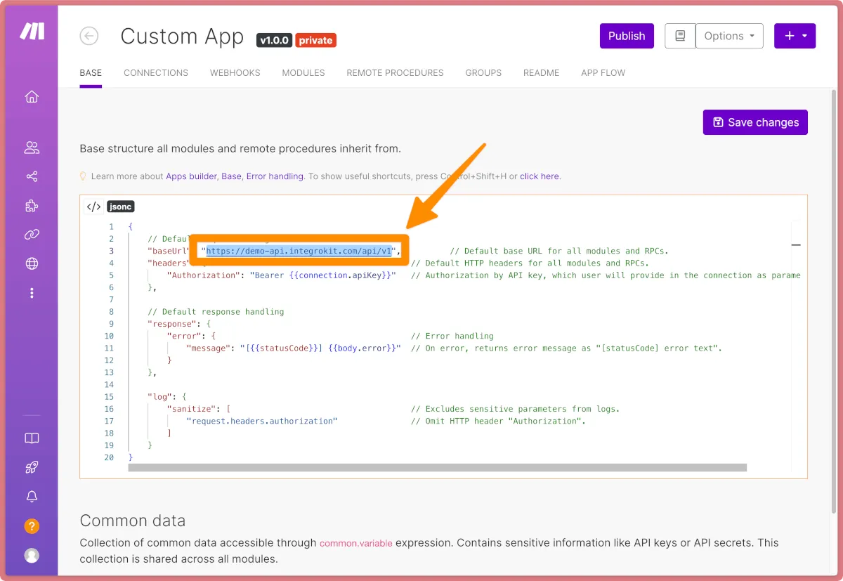 今回は make が用意しているデモAPIを使います。BASEタブから baseUrl に https://demo-api.integrokit.com/api/v1 を入力します。