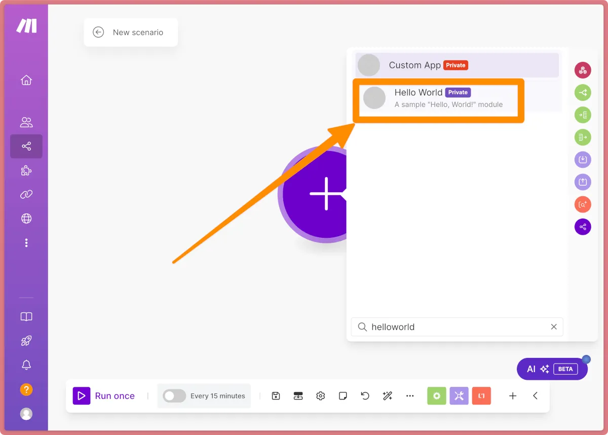 このモジュールはもう利用可能になっているので、シナリオを作成してテストしてみます。モジュールの検索で「helloworld」と打てば先ほど作成したCustom AppおよびHello Worldモジュールが表示されるはずです。