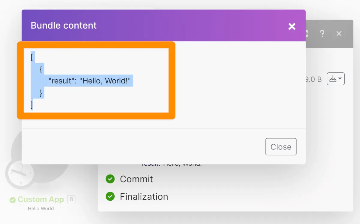 これは先ほど作ったモジュールにAPIからのレスポンスの定義がされていない為です。というわけで、モジュールの設定を変更していくのですが、その前に今回実行した結果をダウンロードしておきます。実行結果から「Download output bundles」すると、レスポンスの情報が表示されるので、コピーしておきます。