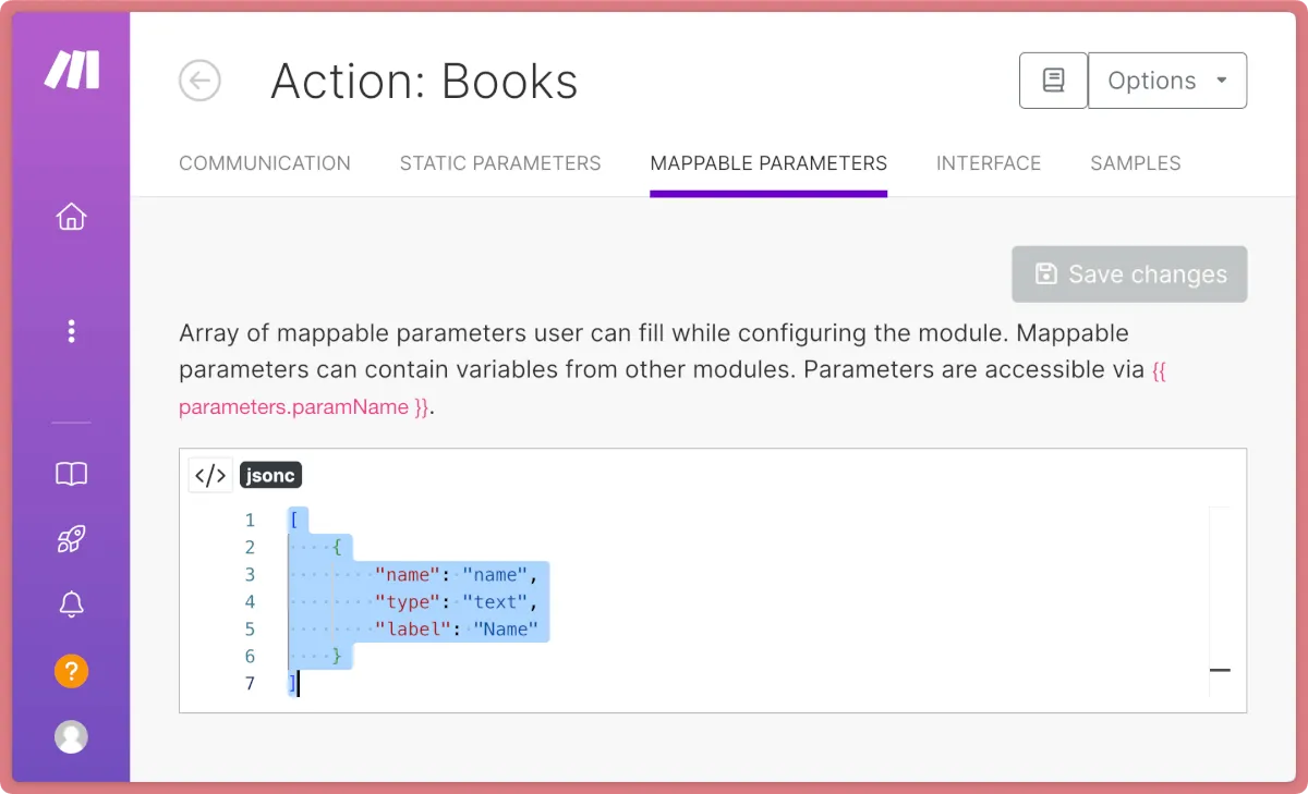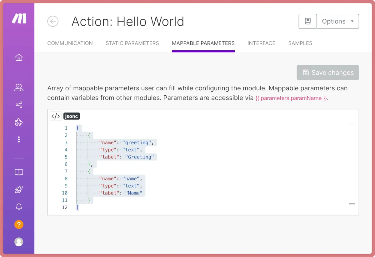 /helloworld はgreenting とname の2種類のパラメータを取ることが可能です。例えばgreenting="Hello" とname="okash1n" を付与してリクエストすると、{"result":"Hello, okash1n!"} がかえってきます。これらのパラメータをモジュールで受けられるようにします。(通常、APIがどんなパラメータを受けられるかはAPIのドキュメントを参照します)