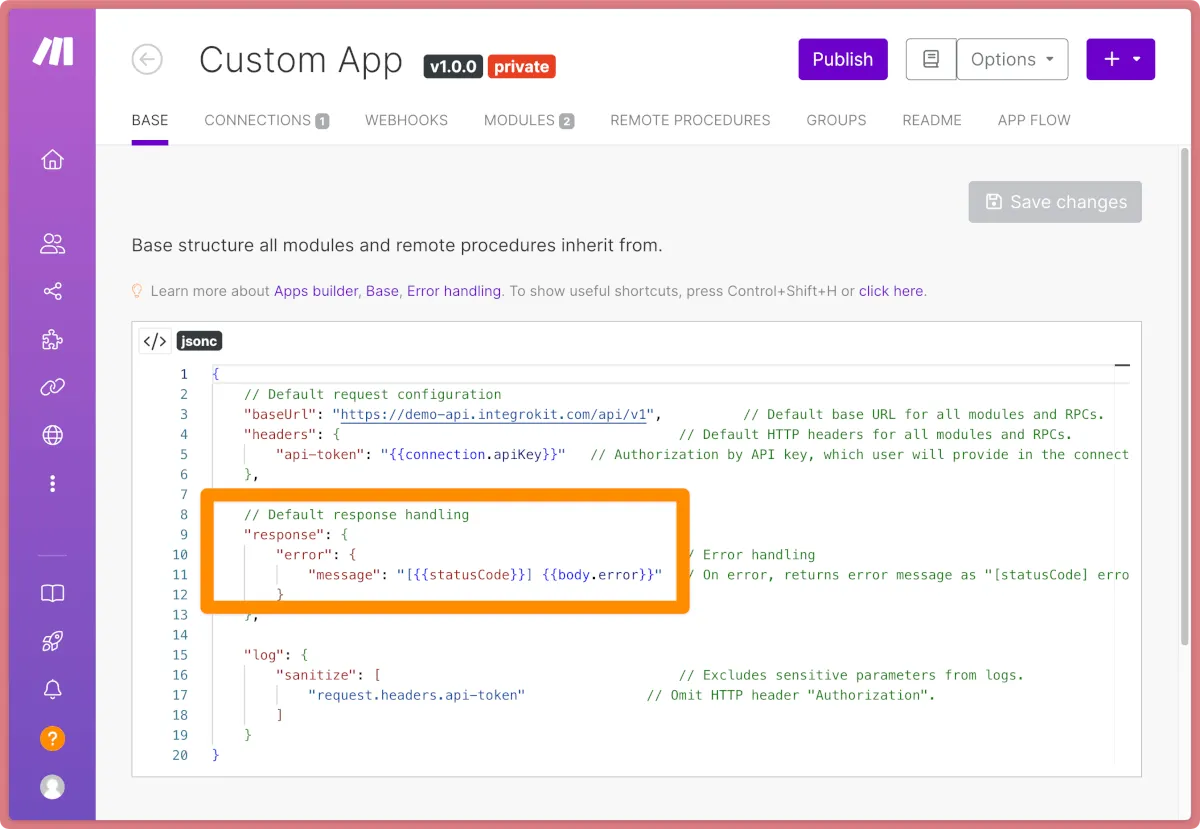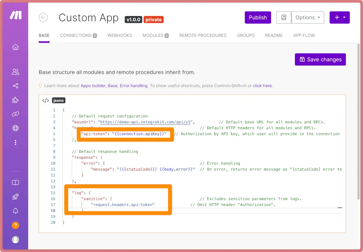 この401エラーのBody「Invalid or missing API key」はどのようにして表示されたかというと、Custom AppsのBASEの設定内容に依存しています。