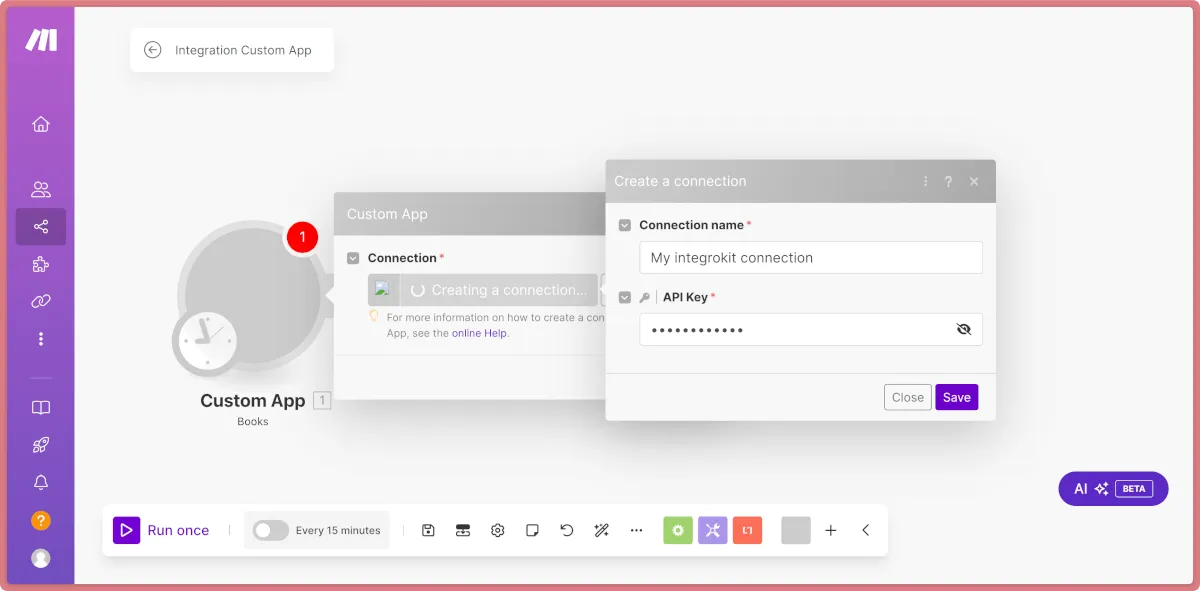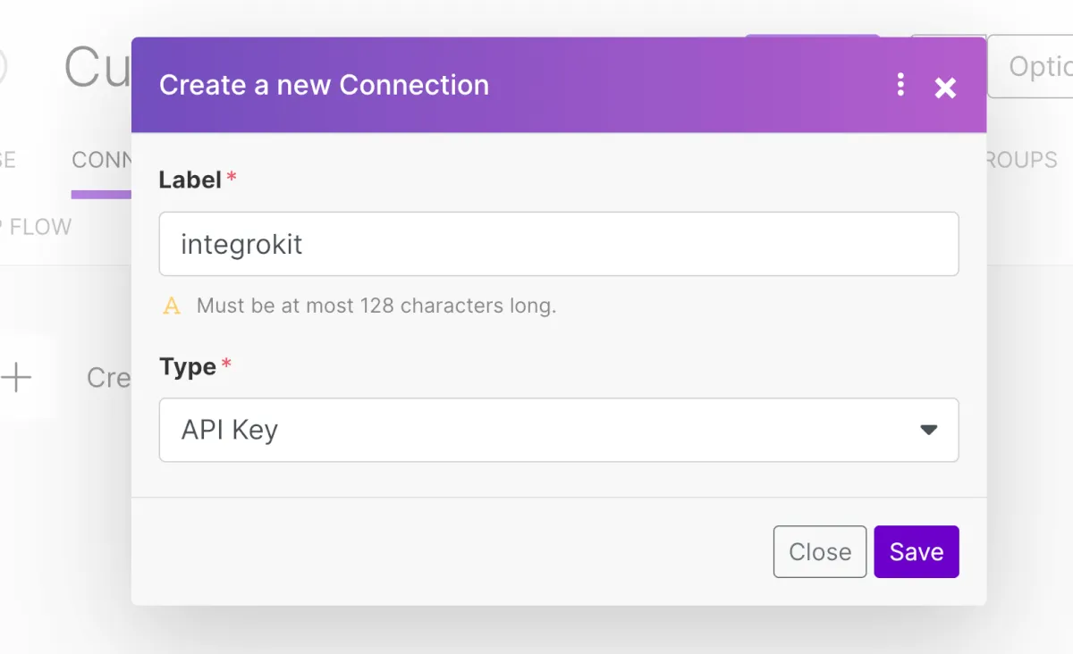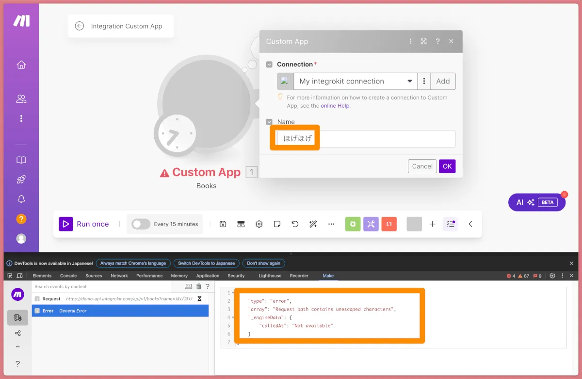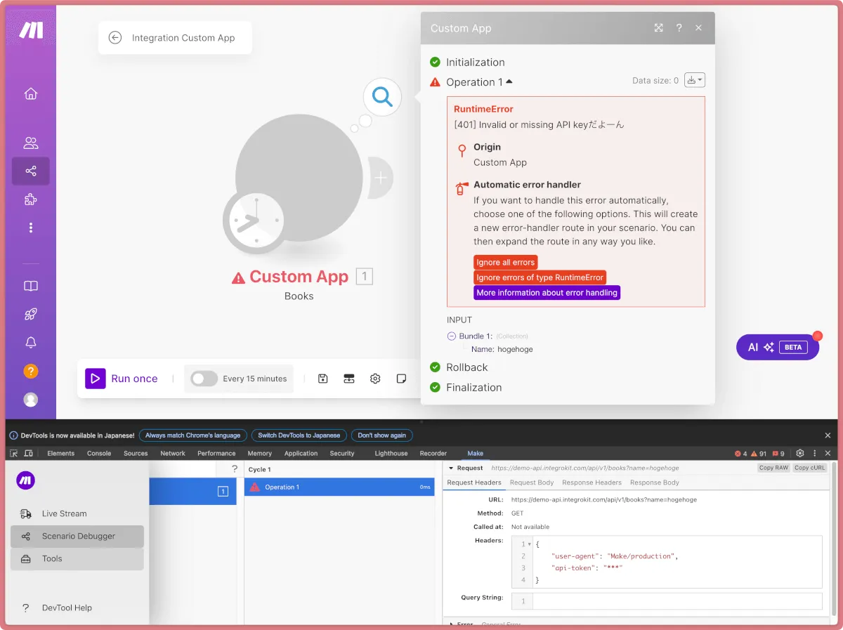 {"error":"Invalid or missing API key"}makeのCustom Appsでももちろん認証の機構を備えており、CONNECTIONSから設定できます。