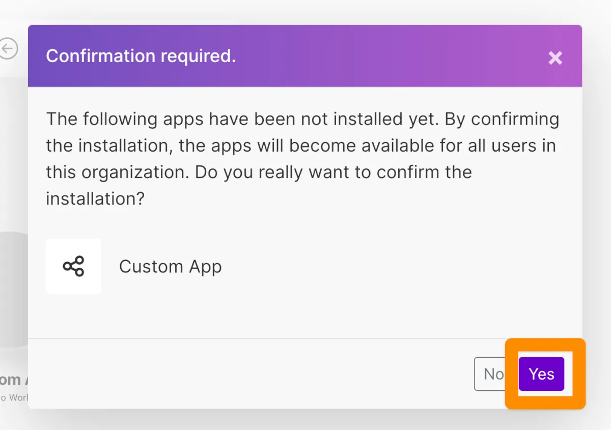 インストールするかどうか聞かれるので、Yesをクリックします。Custom Appsは作成後初めて利用する際はインストールする必要があるみたいです。