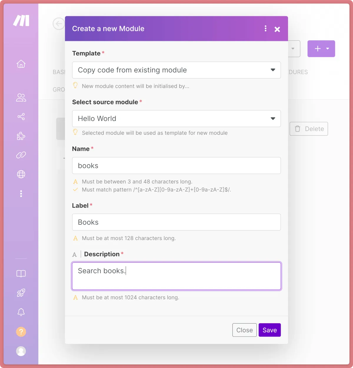 APIキーを受け付けられるモジュールを新たに追加します。MODULESから新しくモジュールを追加して/books のエンドポイントのモジュールを追加します。ほとんどの設定はHello World のモジュールと共通なので、Copy code from existing module で設定します。