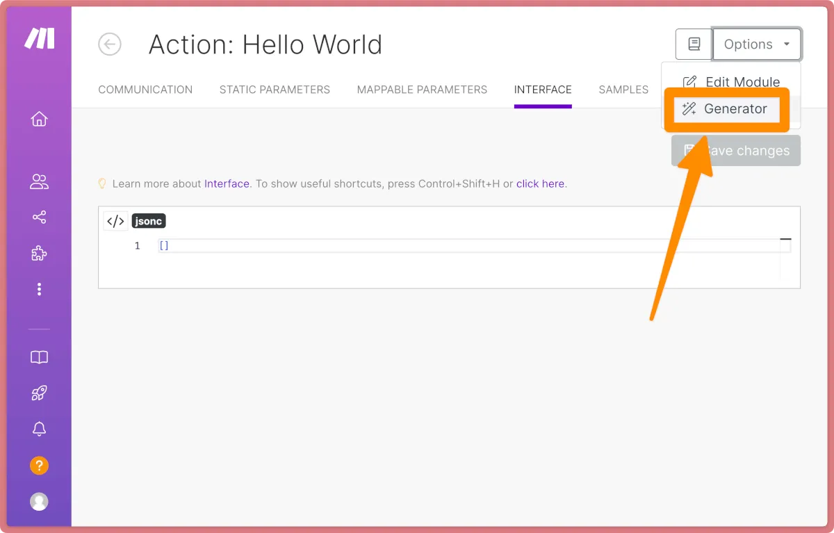 Custom AppsのモジュールのINTERFACEを開き、OptionsからGeneratorを起動します。
