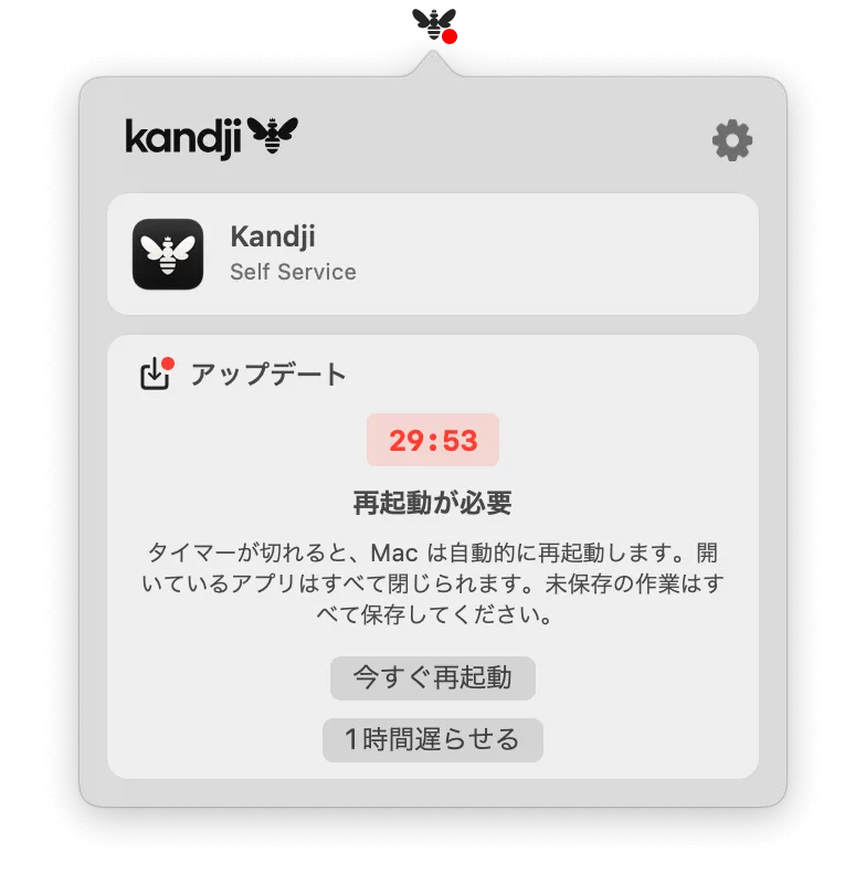 Auto Apps(Kandjiが用意しているアプリカタログ)にあるアプリであれば自動アップデートの構成が可能です。基本的にはバックグラウンドで自動更新する運用になるかと思いますが、Kandjiメニューバーアプリから通知し、促すこともできます。