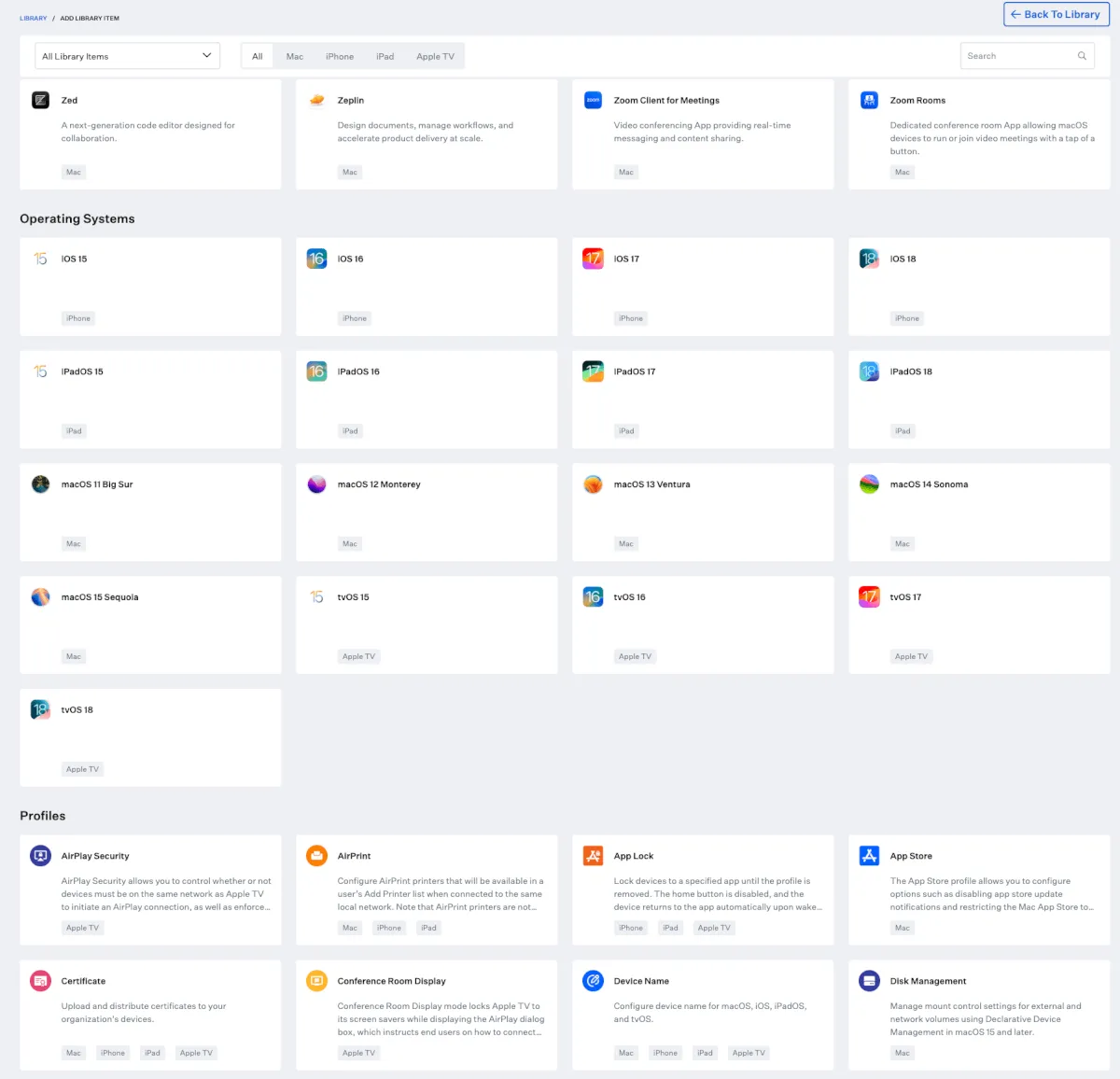 一応カテゴリフィルターやOS種別フィルターはあるものの、ひとつ設定を追加すると設定済みLibrary Items一覧画面に戻ってしまい全表示に戻ってしまうのでいちいち設定していくのがめんどくさいです。