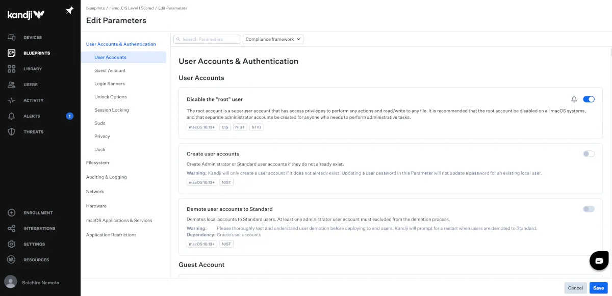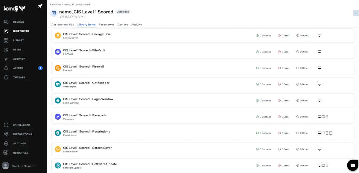 なにかと話題になりがちなCISベンチマークですが、実装しようと思うとドキュメントを読み込み、構成プロファイルやスクリプトを組み合わせて試行錯誤する必要があります。Kandjiでは構成プロファイルだけでなくスクリプトで実装しなければならない項目までテンプレートが用意されているため、スクリプトの検証や調整を行う必要がありません。