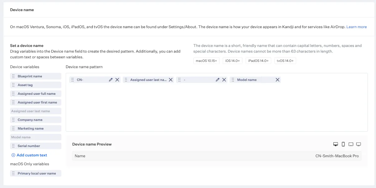 これも比較的悩むことが多い項目です。基本的にスクリプトで対応することが多いのですがKandjiにはテンプレートが用意されており、ユーザー名、シリアル番号、モデル名など命名規則の要件が合えば設定が簡単です。