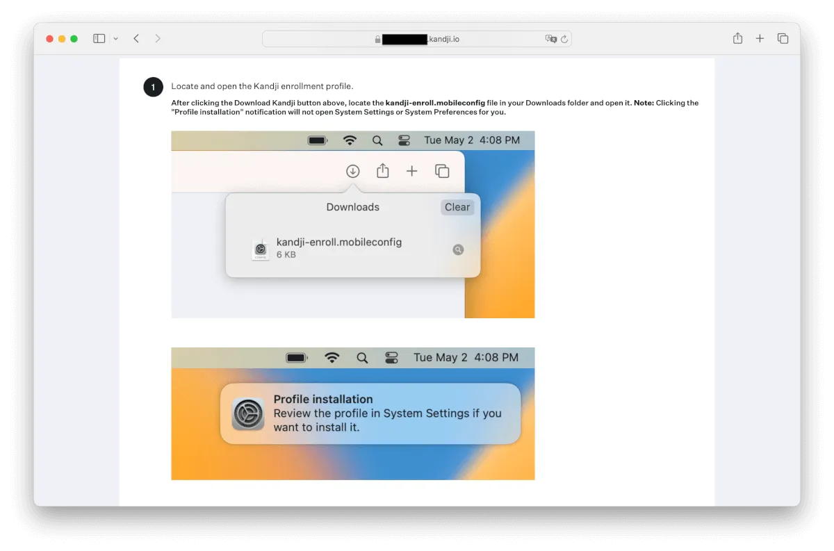 手動でデバイスをKandjiに登録する場合のページも画像付きで手順の案内があるため、管理者が別途作成する必要もありません。