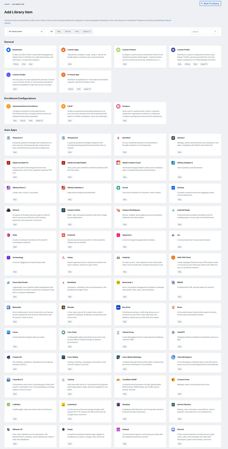 アプリや設定を追加する場合にKandjiが用意してくれているリスト(Library Items)から追加するのですが、Auto AppsとしてKandjiが事前に用意してくれているアプリリストが膨大にあり、設定したい項目まで辿り着くのにそこそこスクロールが必要です。しかも前半にAuto Appsの一覧があるため、設定系の項目は最下部までスクロールが必要です・・・