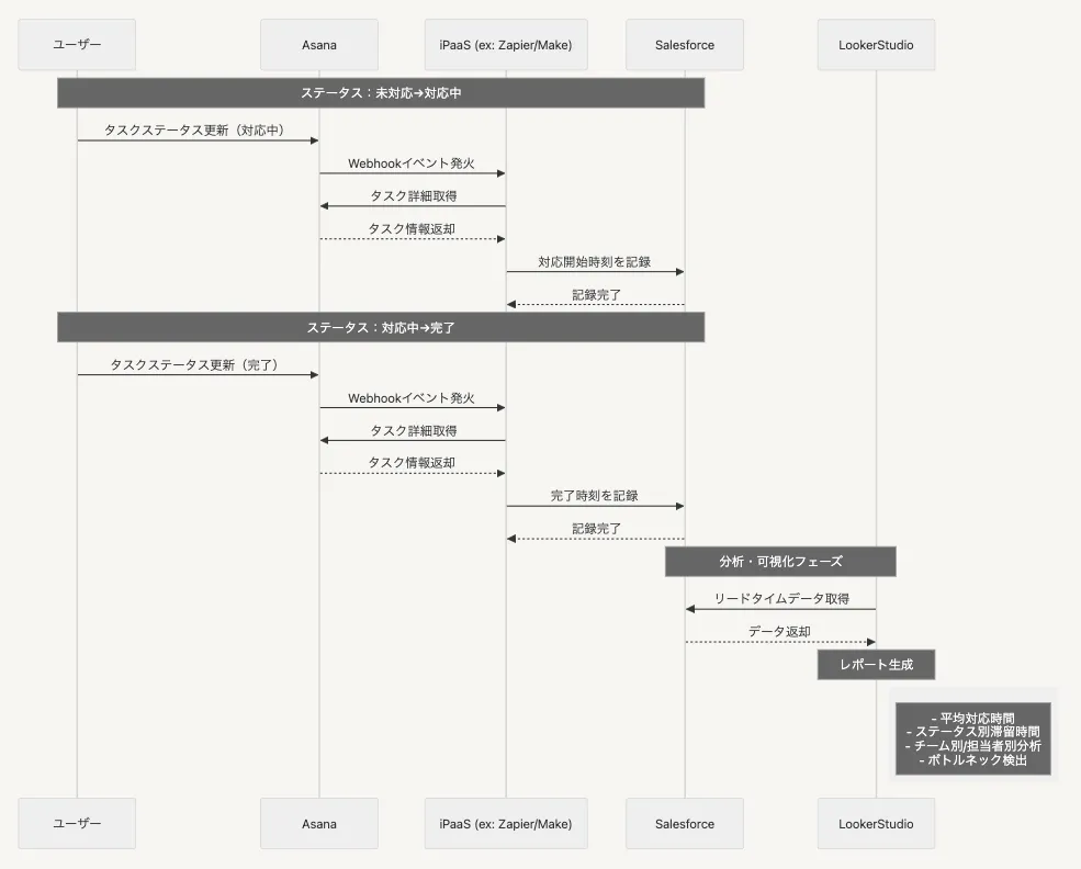 お客様からの問い合わせチケットのステータスが「未対応 → 対応中 → 完了」に変わるたびにWebhookが発火し、データベースに時刻を記録してBIに流してます。BIはまだ社内にお披露目してないけど。