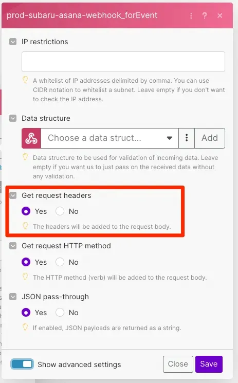 1-a-1.Webhook作成時、Get request headers にYesを入れる