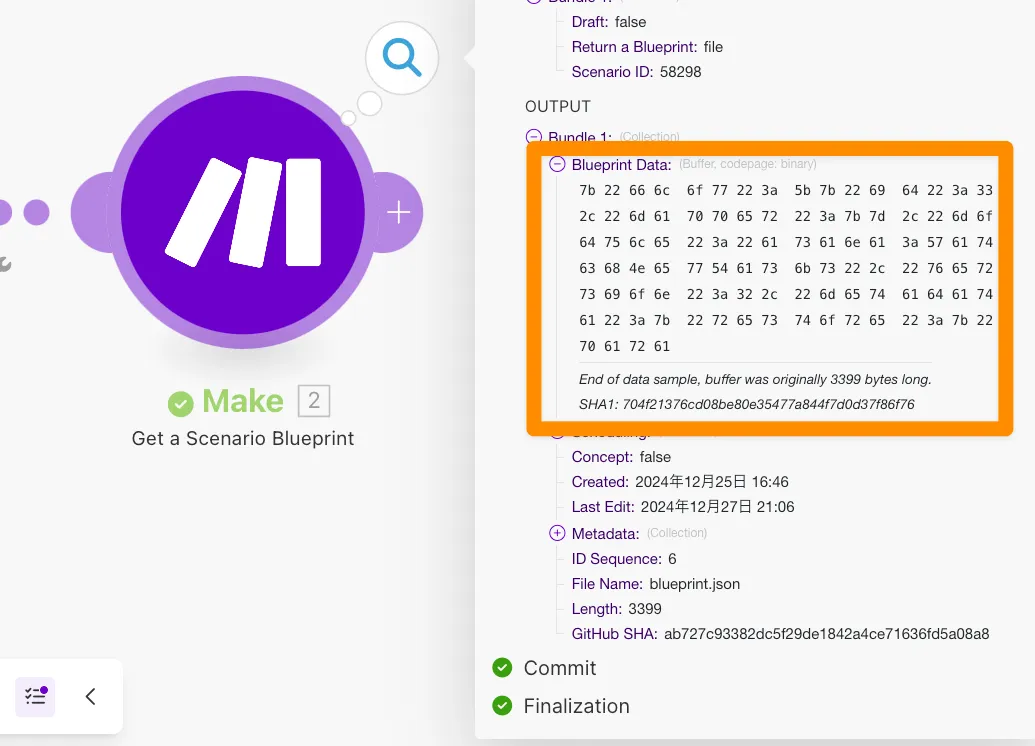 最終的にはGitHubでdiffを取ることを目的とするのですが、①の場合だと分解されたJSONから再度JSONを構成しなおして、リクエストに含める必要があり、毎回JSONの構成も変わるのでMakeでシナリオを作るのが困難です。また③の場合はMake単体でバイナリを処理するモジュールが存在していないのでこれも使えません。
