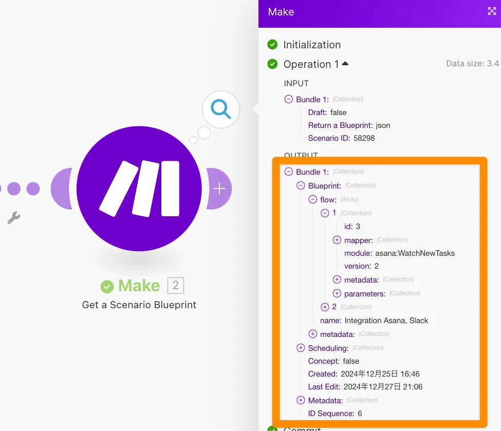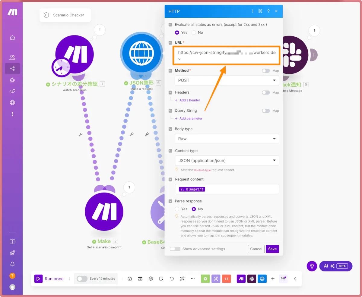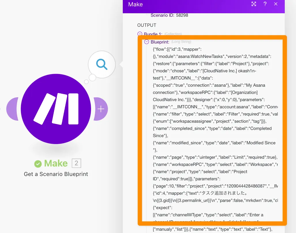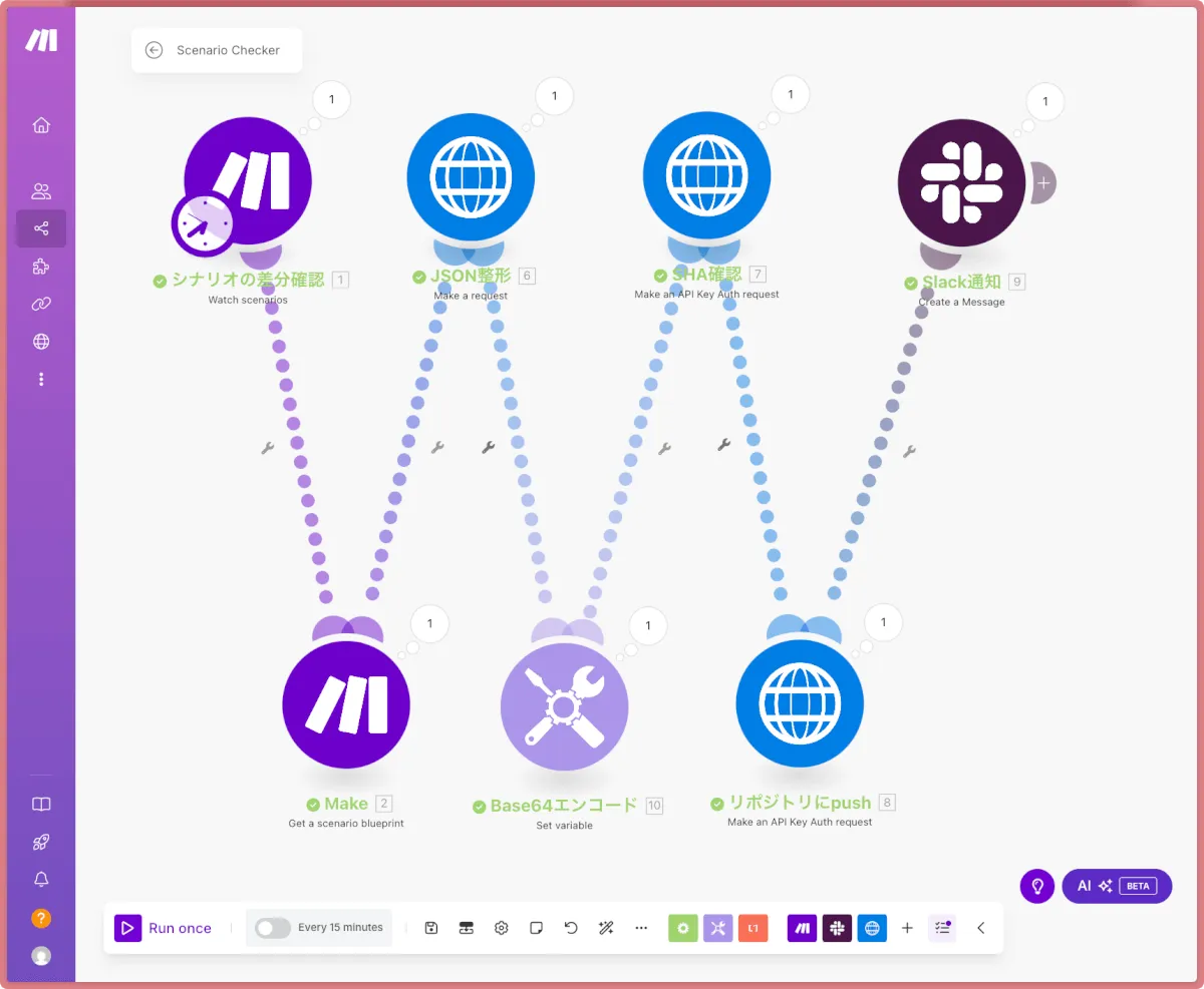 - 変更を検知したら、MakeのAPIを叩いて、変更後のシナリオのBlueprint(JSON)を取得