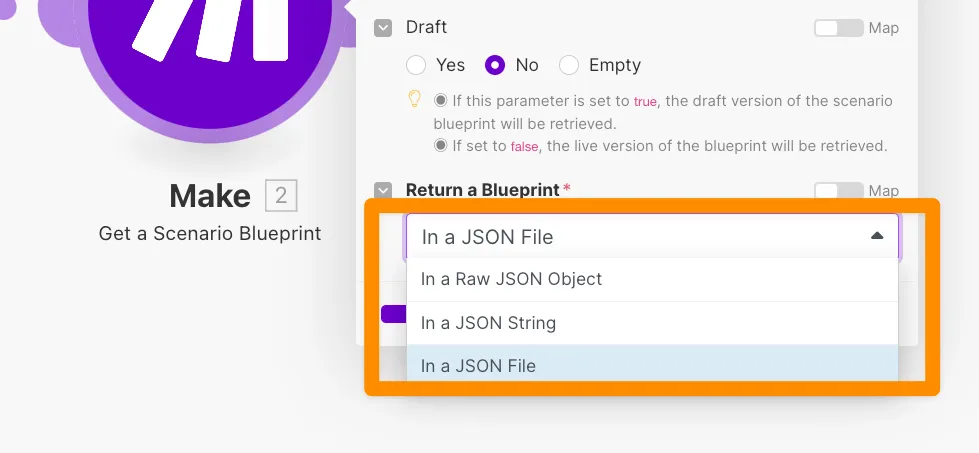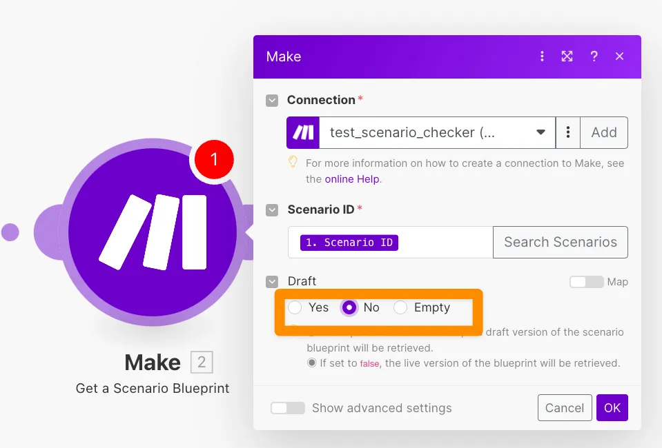 「Draft」の部分はNoにすると「ON」になっているシナリオだけ、Yesにすると「OFF」になっているシナリオだけ、Emptyにするといずれの状態でも取得します。