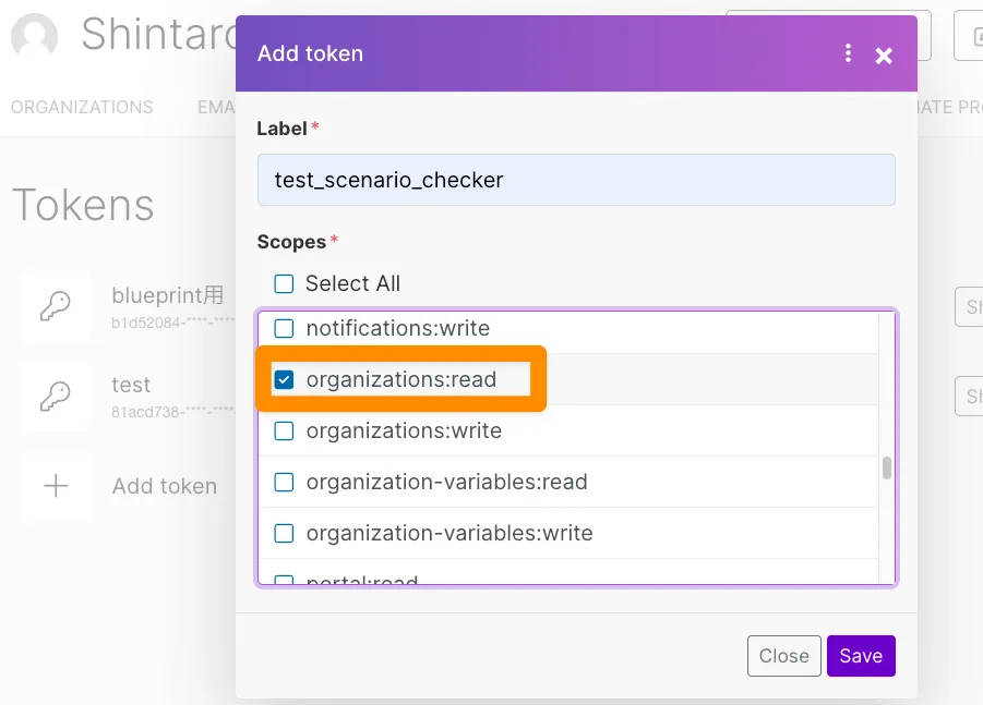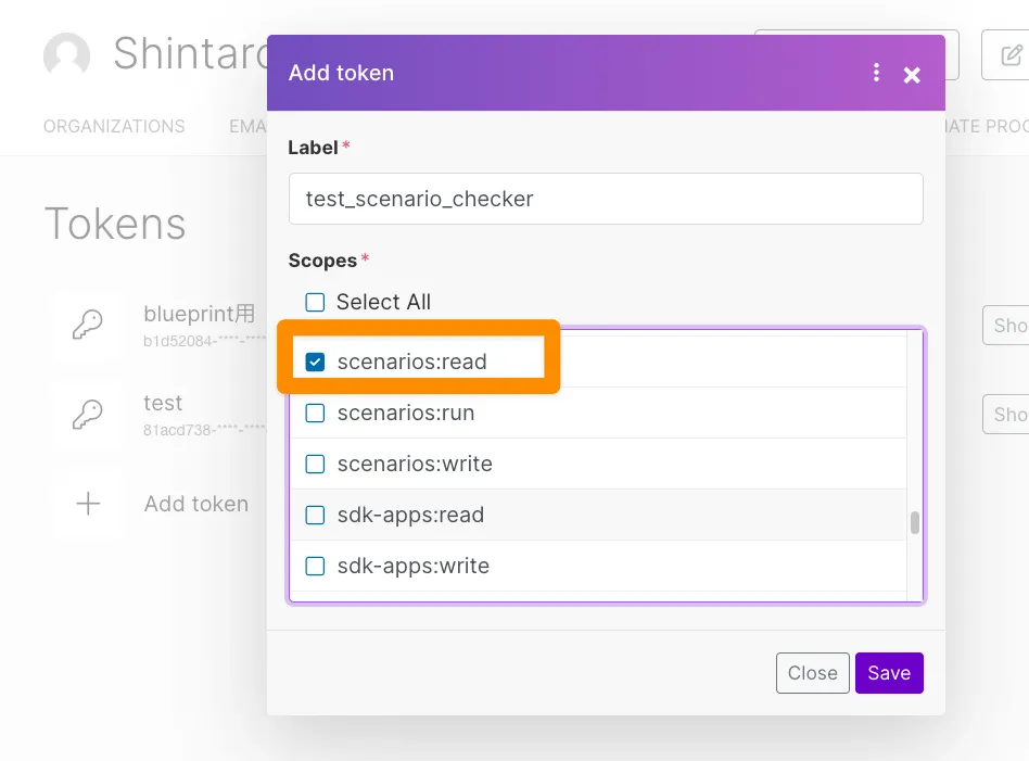 organizations:read と scenarios:read のスコープを有効にし、Labelをつけて保存します。Makeモジュールについては基本的に何をやるにしても organizations:read が必要だと思います。何故かというとモジュールの設定画面でOrganizationを選択する箇所があるのですが、このスコープがないと選択自体ができずモジュールを保存できません。ちなみにTokenは後からスコープを変更できないので、スコープが足りていないことを確認する度にTokenを再作成し、Connectionも変更する必要があり、非常にだるいです。まじキレそう。