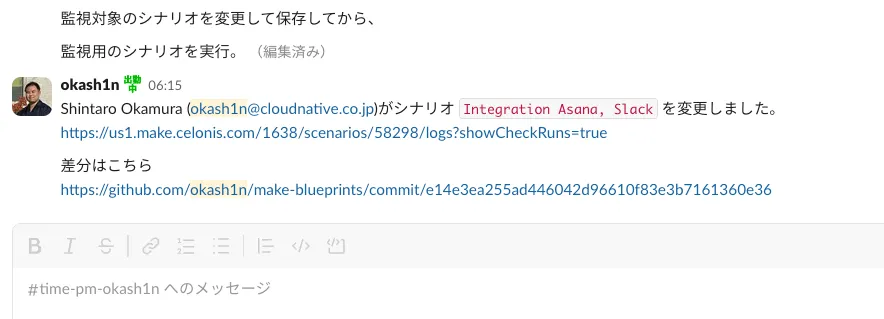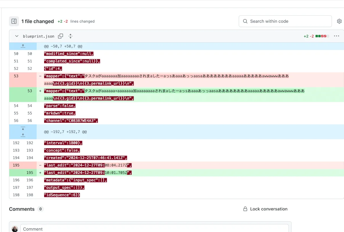 これは監視対象のシナリオで、タスクが追加されたときのSlack投稿されるメッセージ部分に適当な文字列を追加した、という変更ですが、インデントなど全然できていないものの「どこが変更されたかを視覚的に簡単に把握する」という目的そのものは達成できているのではないでしょうか?